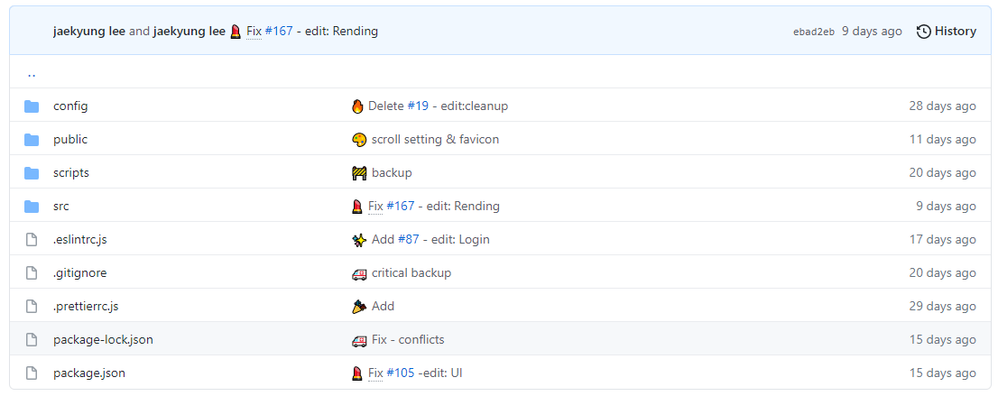 우리는 일관성있고 직관적인, 의미있는 commit message 를 위해서 Gitmoji를 이용했다. 나중에 commit이 쌓일때마다 뿌듯함을 느끼곤 했다. 'push' or 'pull' 이런식으로 명확하지 않고 의미없는 commit message를 방지하기 위함이였다.