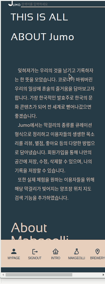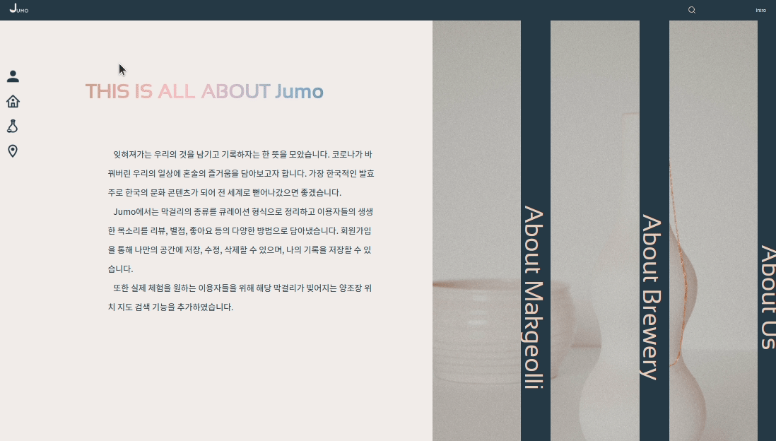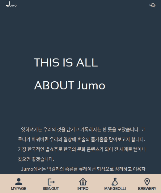 '막걸리'에 관한 서비스를 기획하게 된 이유는 우리나라 전통 술, 막걸리를 젊은 세대들에게도 관심을 주고 싶어서였다. 그래도 주제가 평범한데도 불구하고 정하게 된 이유는 랜딩페이지를 특별하게 만들어보고, css로 열심히(캐러셀, 인피니트 스크롤&애니메이션, 슬라이드 방식 등..) 이쁘고, 참신하게 꾸며보자라는 합의가 있었다.
