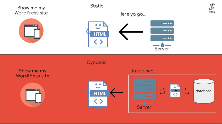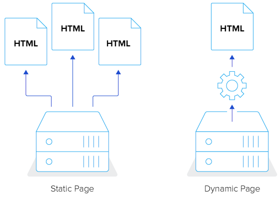 웹의 더 큰 부분은 동적 페이지를 사용한다. PHP (예 : WordPress), ASP, Java, Perl과 같은 스크립팅 / 프로그래밍 언어로 작성된 코드 / 스크립트 , Python, Ruby, 등 사용자가 페이지를 요청하면 서버는 페이지를 처리하고 실행해야한다. 그리고 대부분의 경우 데이터베이스에서 무언가를 요청한 다음 페이지를 “완료”하여 처리해야한다.