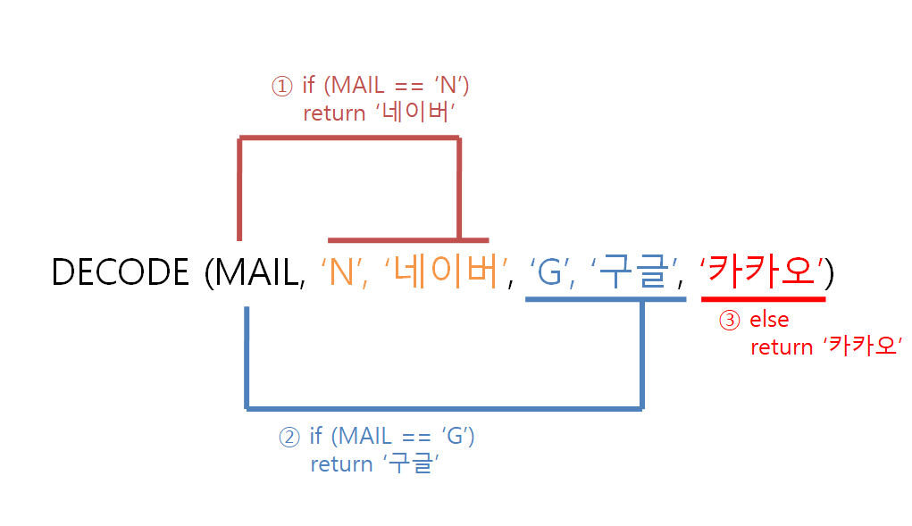 DECODE(대상갑,비교값1,결과1,비교값2,결과2,비교값3,결과3,결과4);
