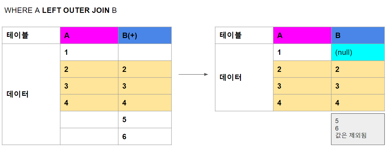 B의 5, 6값은 A에 없는 값이므로 JOIN에 실패하여 제외된다.