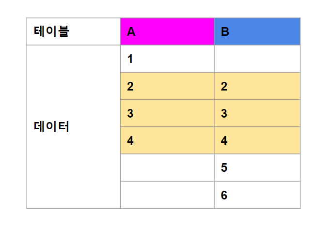 B의 5, 6값은 A에 없는 값이므로 JOIN에 실패하여 제외된다.