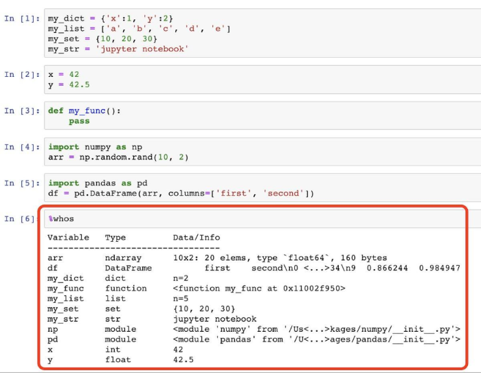 - %whos : 현재 메모리에 올라간 변수들의 목록을 확인한다.