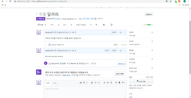 녹색 병합 요청 요청 버튼을 클릭하여 성공적으로 변경 사항을 병합할 수 있었다.