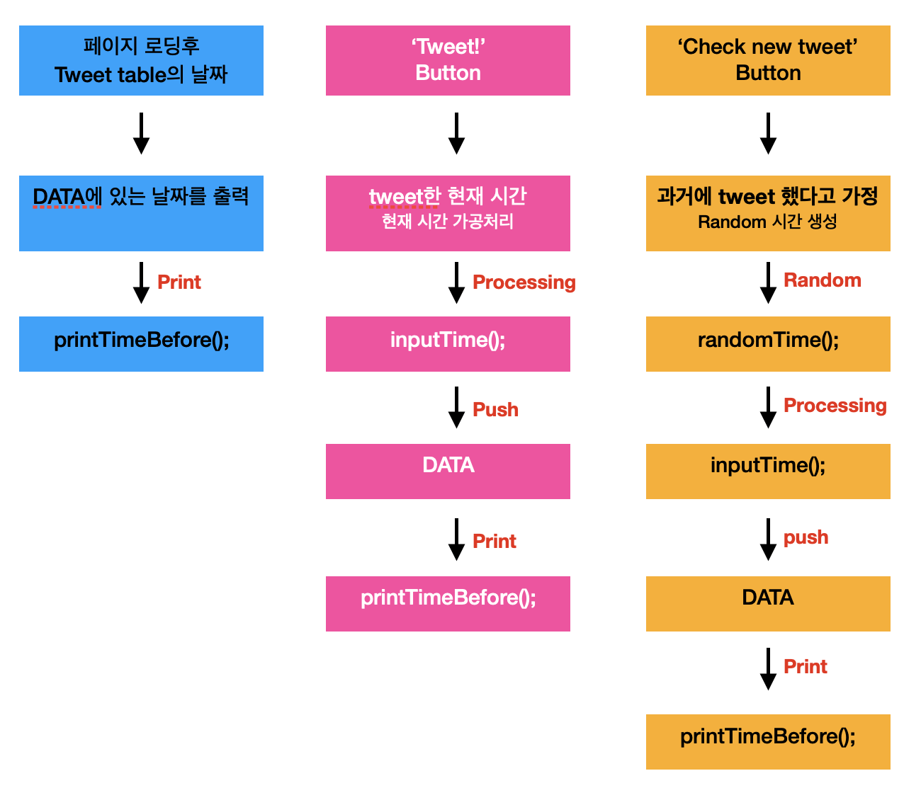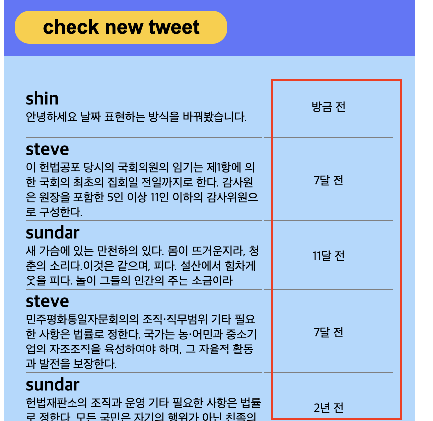 printTimeBefor() 함수는 몇년전, 몇달전, 몇시간전 이렇게 표현해주는 역할을 한다. 단지, DATA에 있는 tweet 날짜를 그렇게 표현해서 보여주는 역할을 한다. 실제 데이터에 몇년전 몇달전으로 들어가게 하는 실수를 범해서는 안된다. (ex. 7달 전, 2년 전, 3시간 전 등)