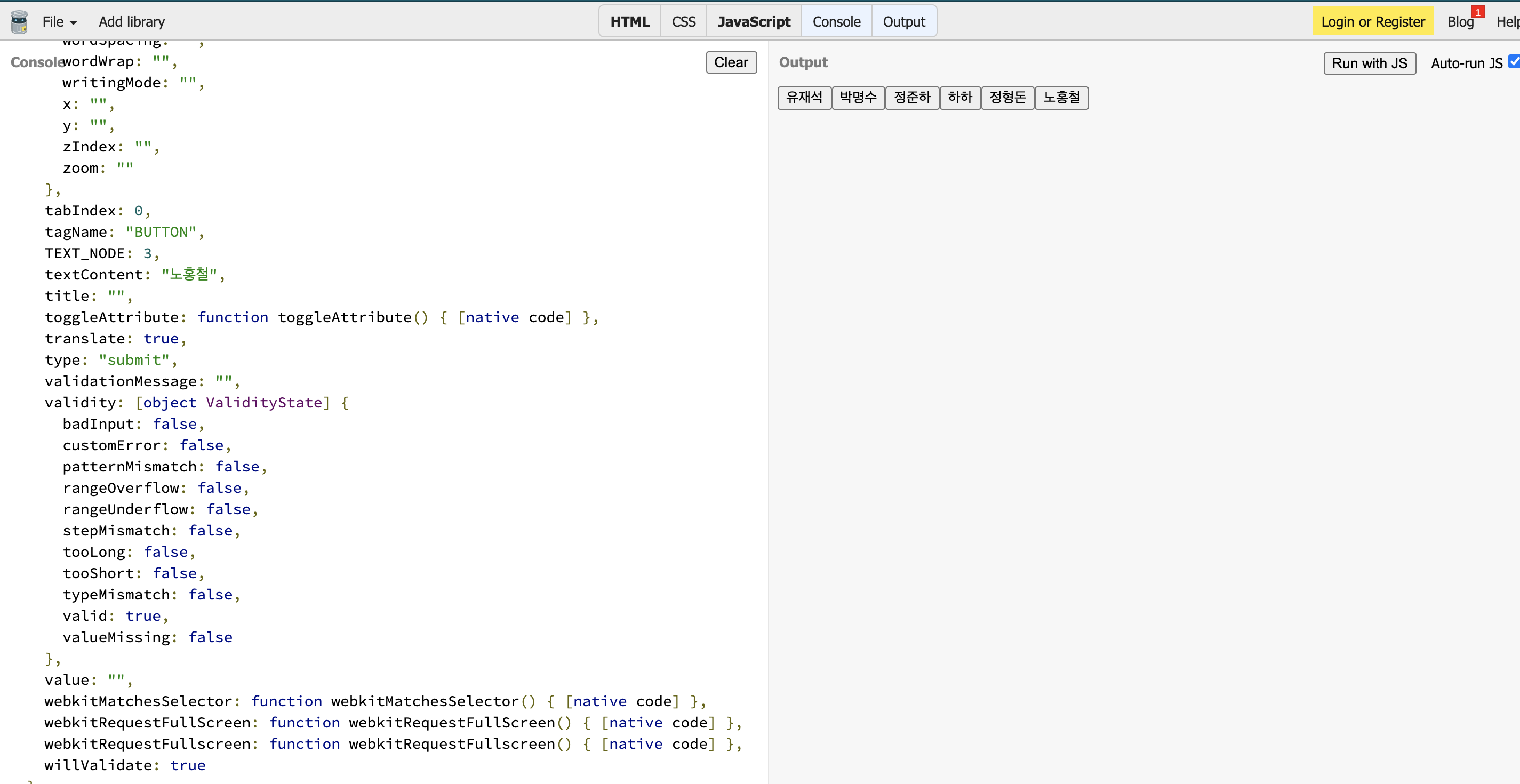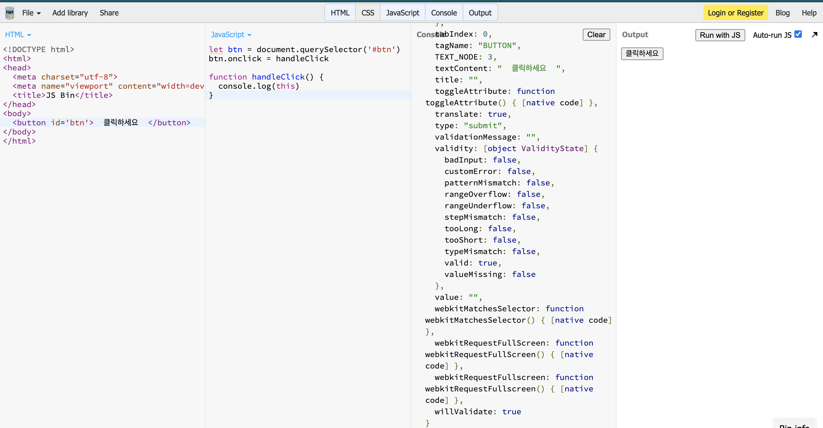 각 버튼을 클릭할 때, 이름이 콘솔로 표시되게 만들어 본다.