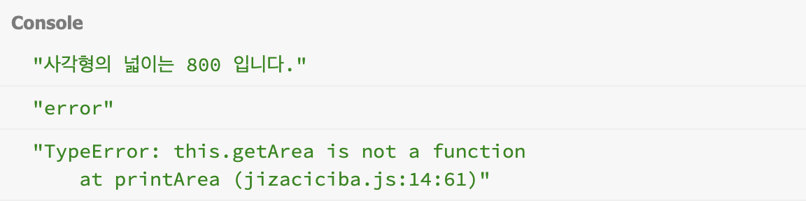 console.log('사각형의 넓이는 ' + this.getArea() + ' 입니다.')