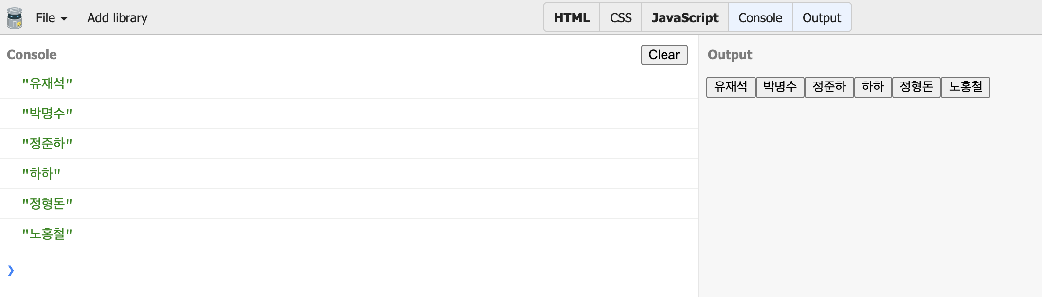 왼쪽이 콘솔창 <-> 오른쪽은 output